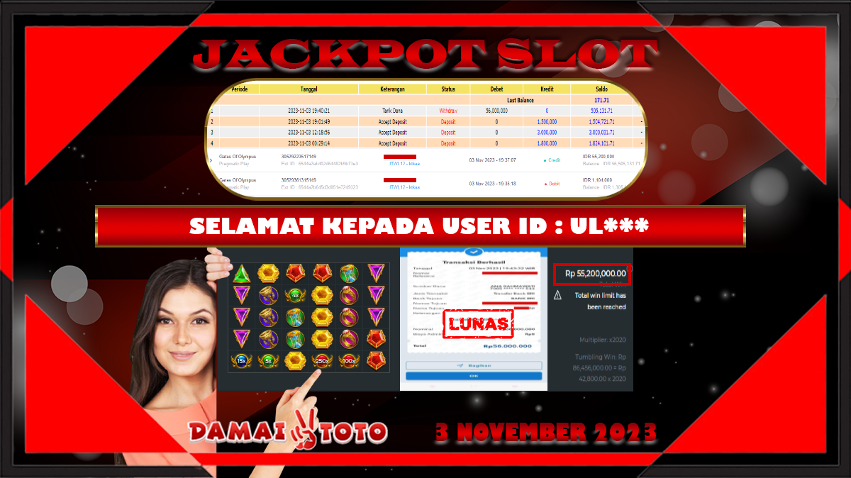Selamat Kepada Pemain Dengan User Id : Ul*** Telah Memenangkan Jackpot Paus Senilai 55,200,000 Di Permainan Gates Of Olympus